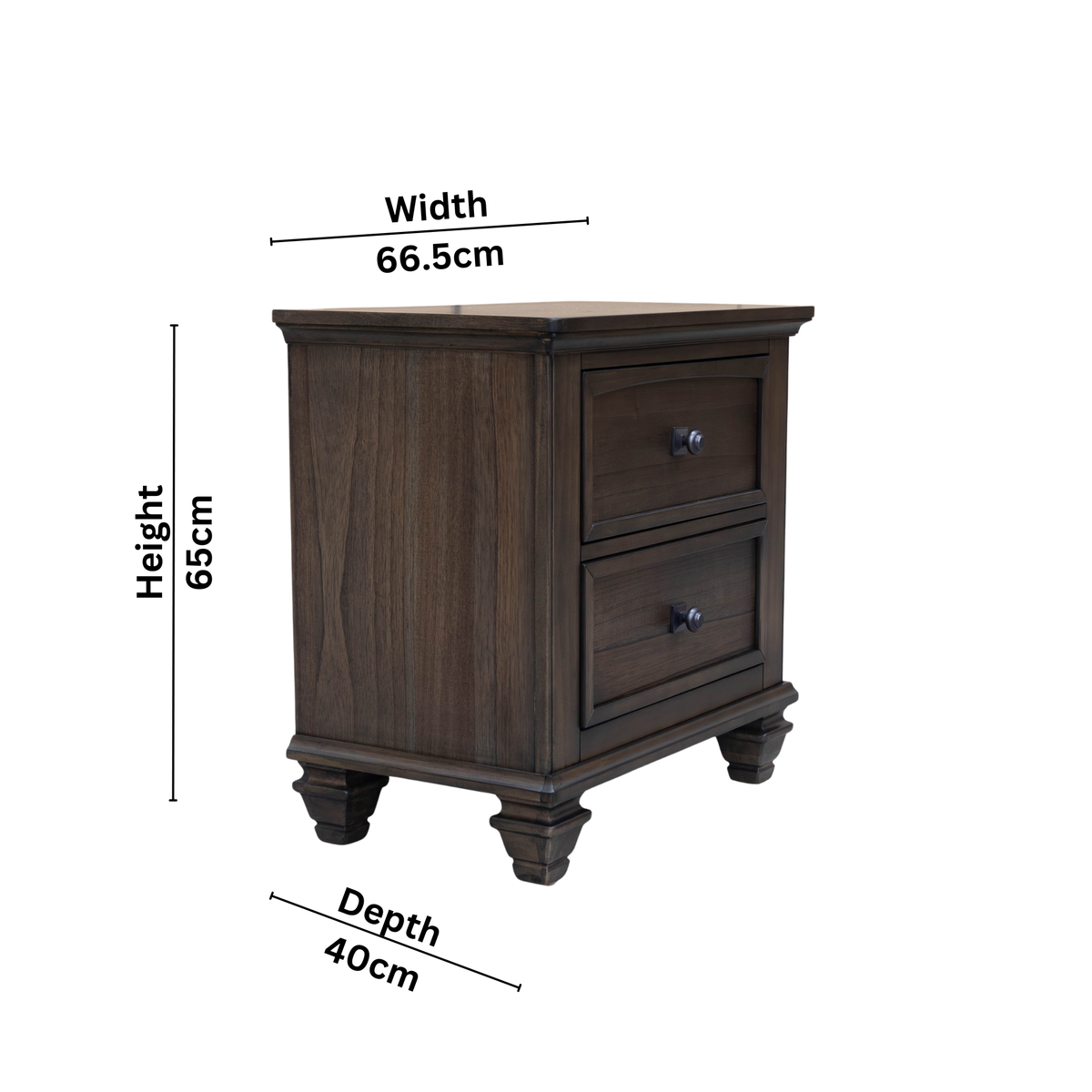 The Library Two Drawer Bedside in Grey Oak offers sturdy metal handles and smooth runners for durable, effortless drawer operation. Its top drawer is lined with soft velvet, providing a protective space ideal for delicate items. This blend of robust hardware and refined interior details ensures both functionality and elegance for your bedroom storage needs.