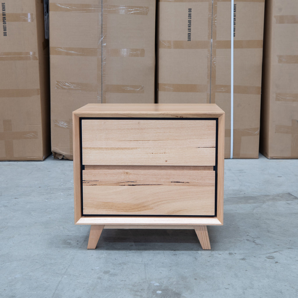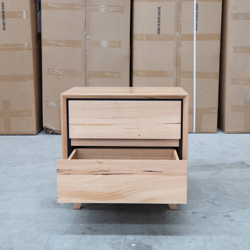 The Dayton Two Drawer Messmate Bedside merges timeless timber craftsmanship with contemporary minimalism. Featuring crisp linear proportions and striking black accents, this piece delivers understated sophistication to modern bedrooms.