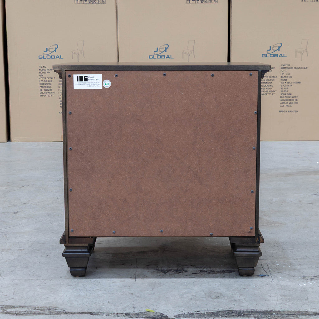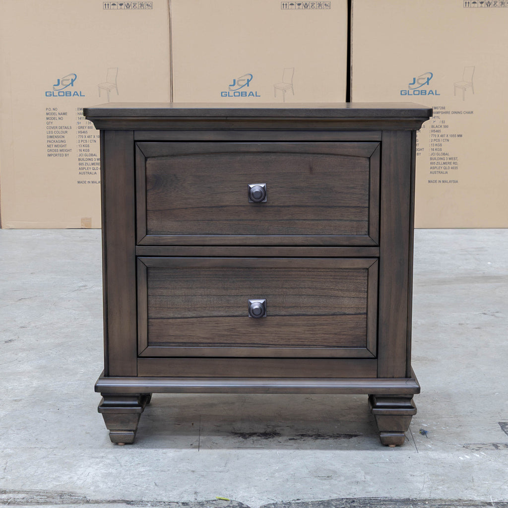 The Library Two Drawer Bedside in Grey Oak offers sturdy metal handles and smooth runners for durable, effortless drawer operation. Its top drawer is lined with soft velvet, providing a protective space ideal for delicate items. This blend of robust hardware and refined interior details ensures both functionality and elegance for your bedroom storage needs.