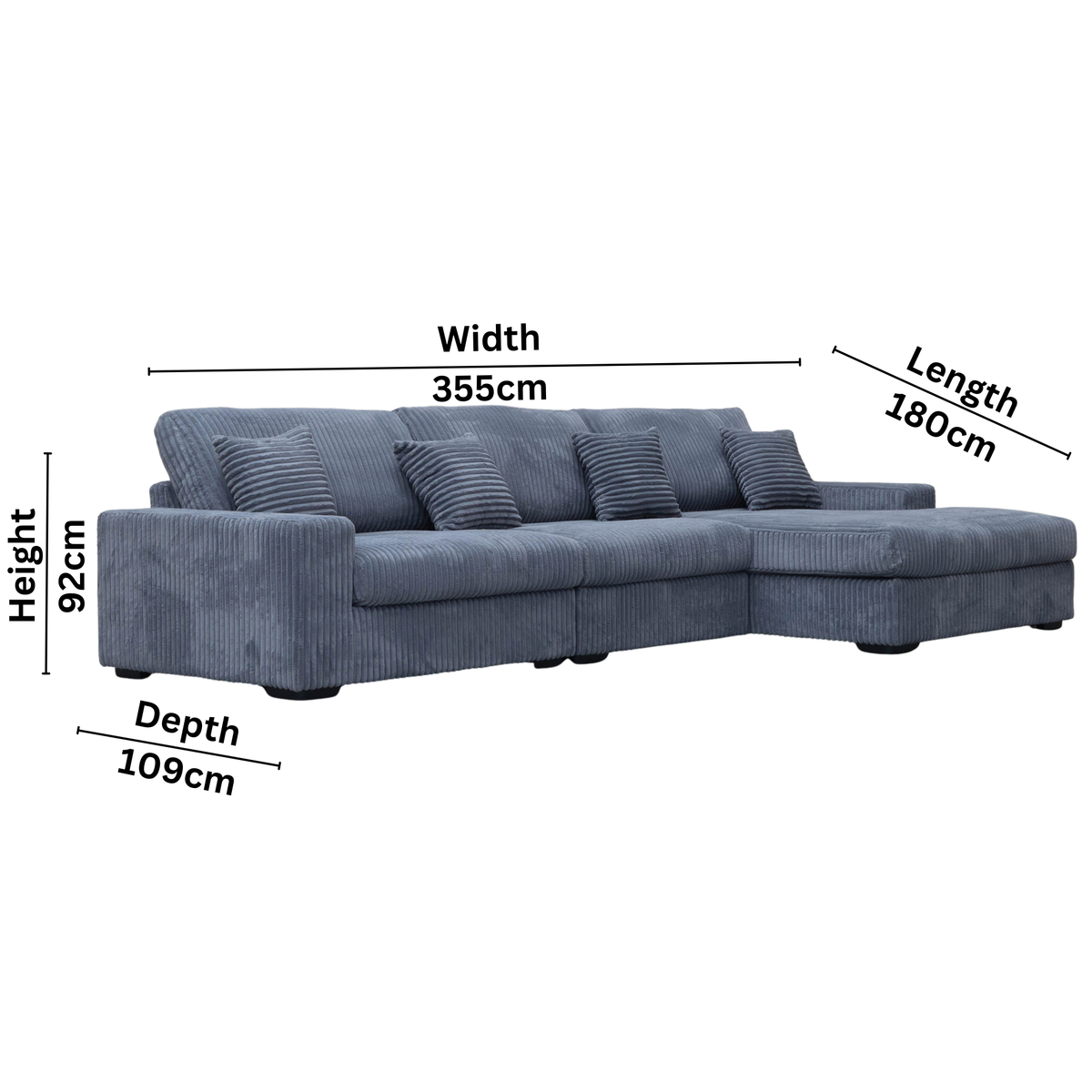 The Elona Plush Chaise Sofa combines oversized comfort with a luxurious thick ribbed fabric, offering a plush seating experience. Its generous proportions and textured upholstery provide both style and durability, making it an ideal centerpiece for relaxation and sophisticated living spaces.