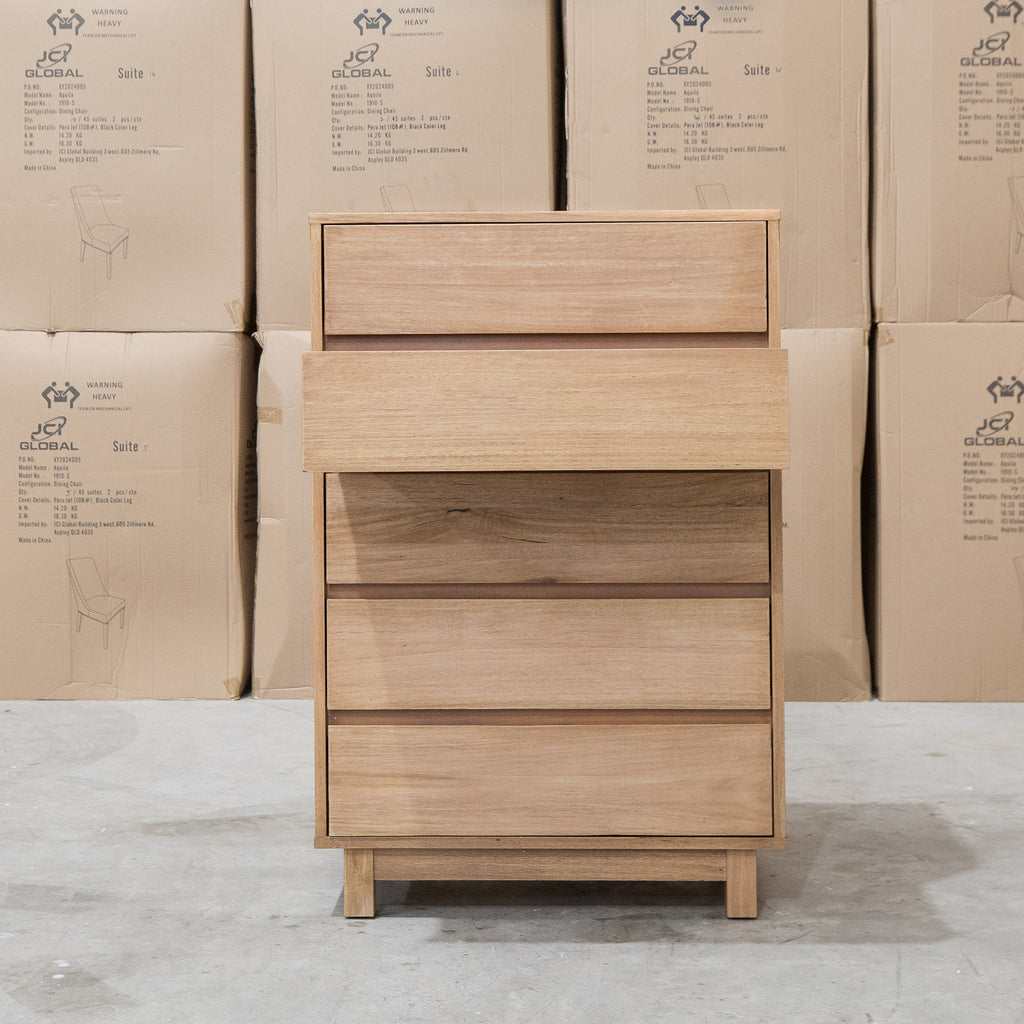 Crafted from natural Mountain Ash, the Mandalay Five Drawer Tallboy combines durability with timeless elegance. Its handle-less design ensures a clean, minimalist look, while the velvet-lined top drawer offer a luxurious, protective space for your valuables. This tallboy is expertly designed to provide both style and functionality for sophisticated storage needs.