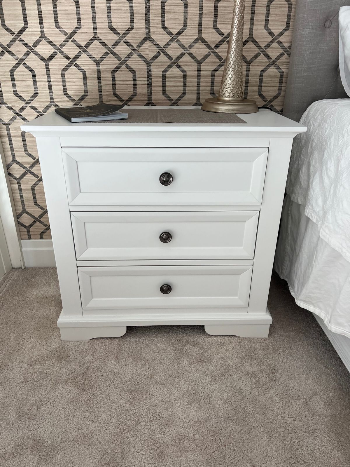 The Sala 3 Drawer Hardwood Bedside combines timeless Parisian-inspired design with a classic white finish, offering both elegance and functionality. Crafted from durable hardwood, it features a velvet-lined top drawer to protect delicate items, making it an ideal bedside companion for refined storage and style.