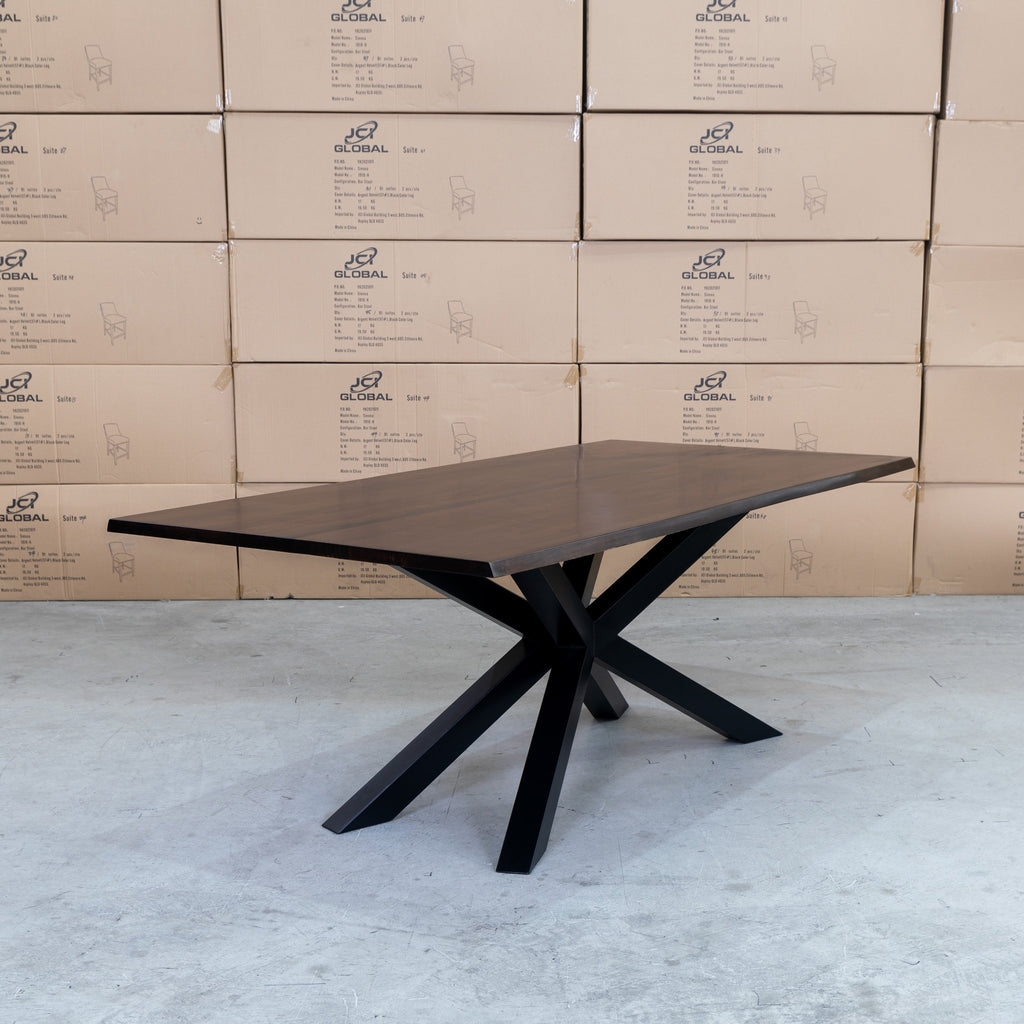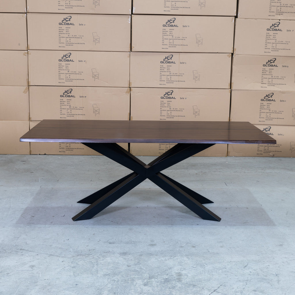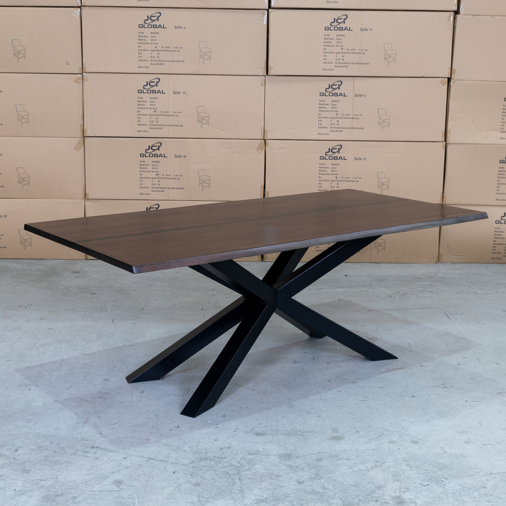Our Valencia Messmate hardwood dining table boasts stunning architectural black metal legs and a warm walnut finish. The live edge design creates a natural feel, while the black resin insert adds a contemporary twist. Built to last, this one-of-a-kind table is perfect for any occasion.