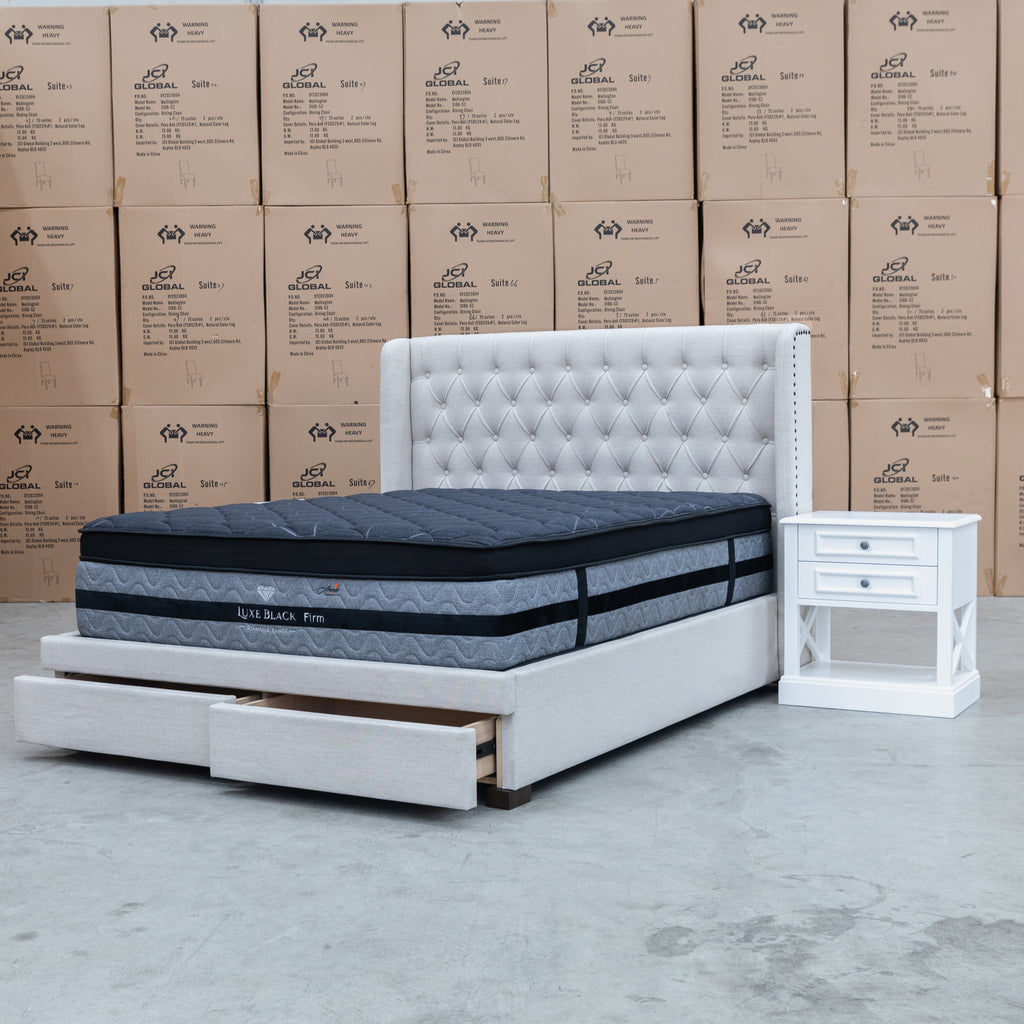 Elevate your bedroom with the Amie Fabric Storage Bed. The button-tufted headboard and black stud detailing add sophistication, while the storage drawers in the footboard provide practicality. Perfect for any modern bedroom, this bed offers both style and functionality.