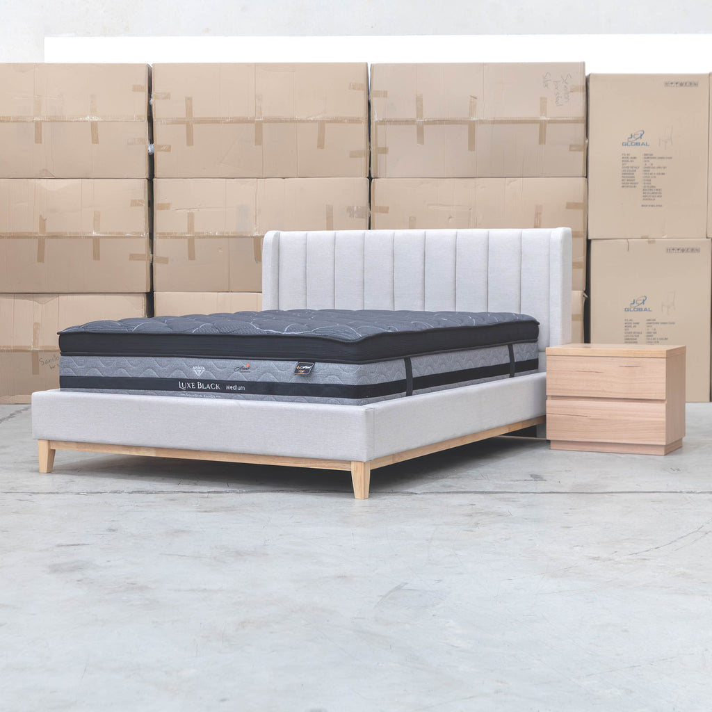 The Paros King Upholstered Bed features a sophisticated channel-stitched headboard that adds a stylish texture to your bedroom. Its sturdy timber plinth base provides reliable support, while the solid timber slats ensure durability and optimal mattress ventilation. Designed with quality materials and expert craftsmanship, this bed combines aesthetic appeal with lasting comfort.