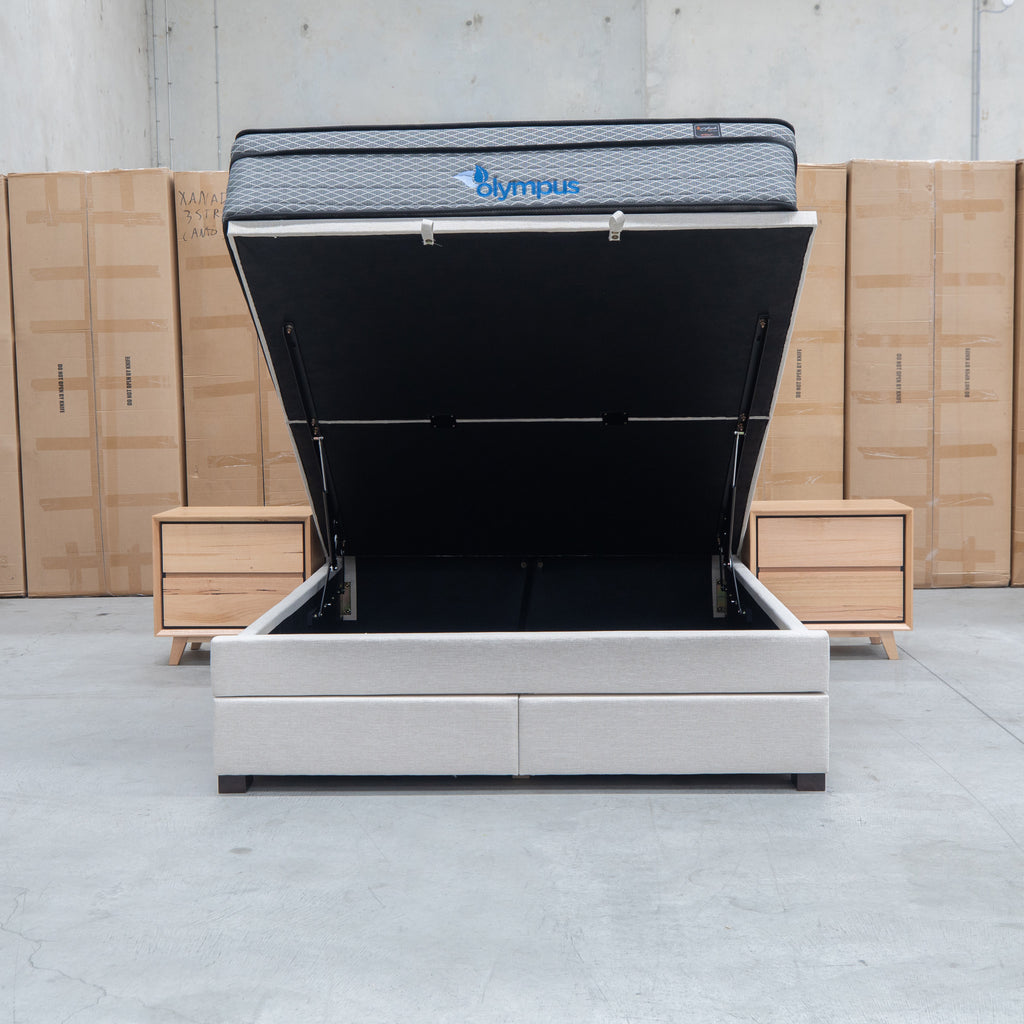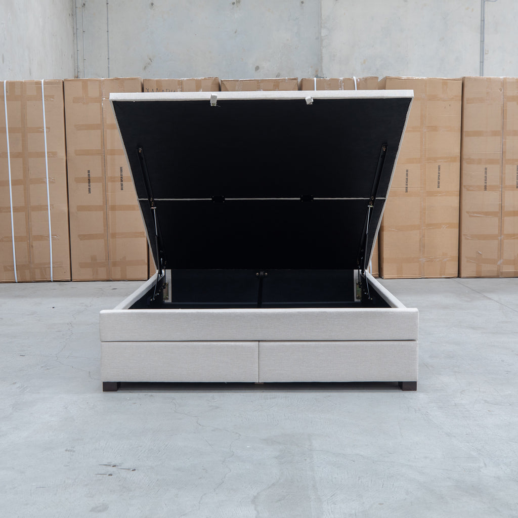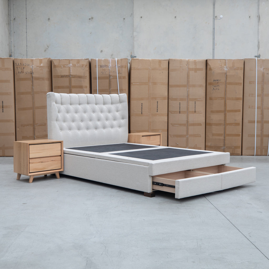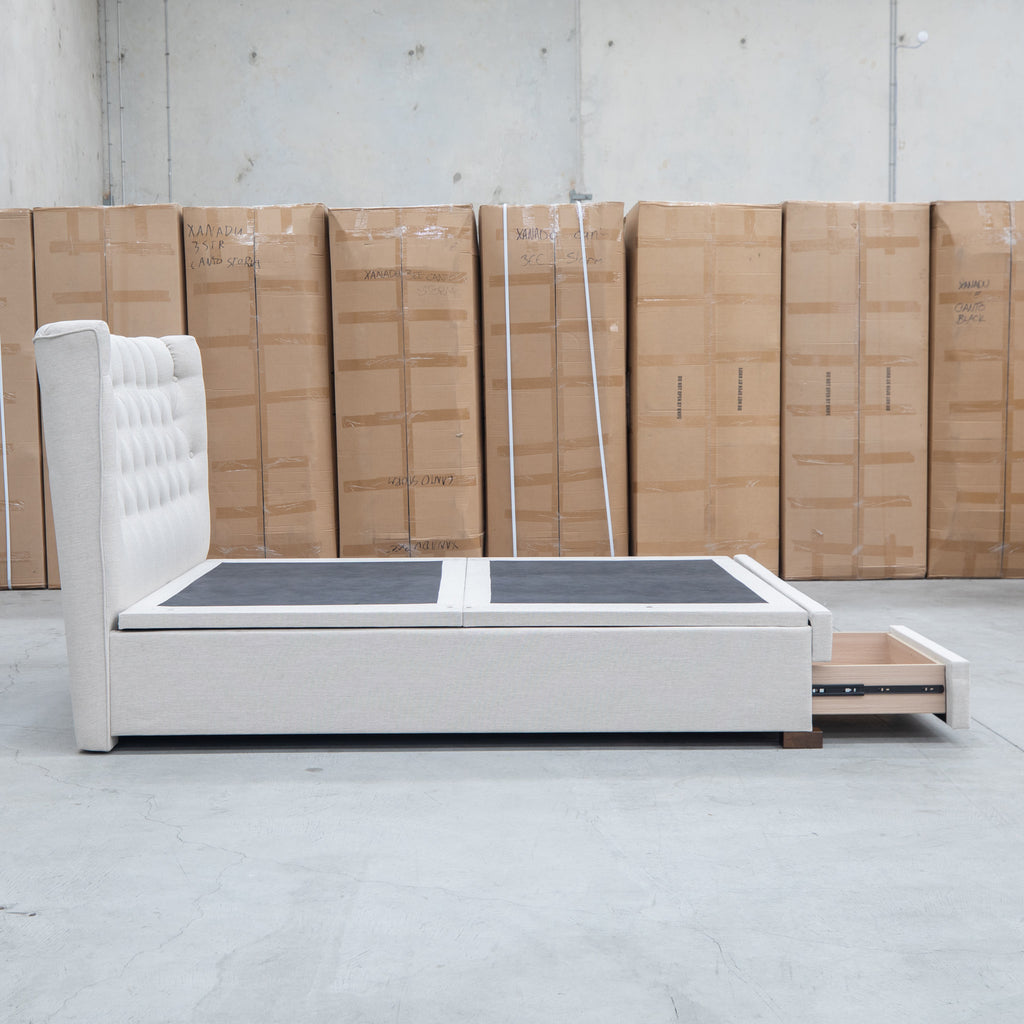 The Blake Queen Upholstered Gas Lift Storage Bed combines sophisticated design with practical functionality. Featuring a button-tufted headboard that adds visual depth and elegance, this bed maximizes your bedroom space with integrated gas lift storage and two built-in drawers within the footboard. The smooth gas lift mechanism provides effortless access to under-bed storage, while the oat white upholstery offers a versatile, contemporary aesthetic that complements any décor.