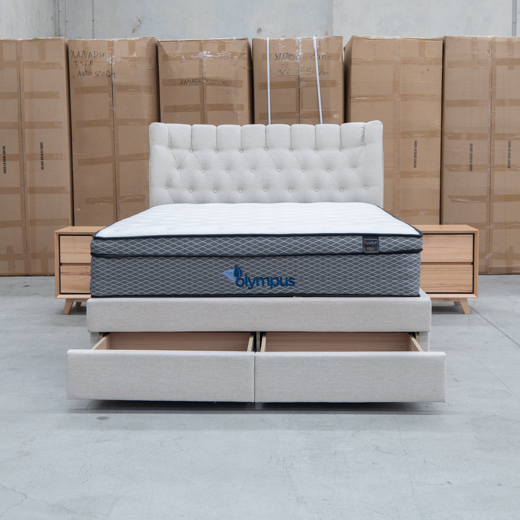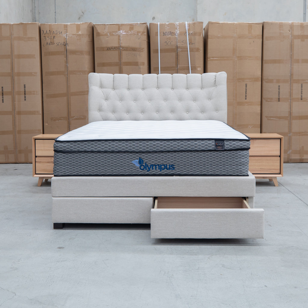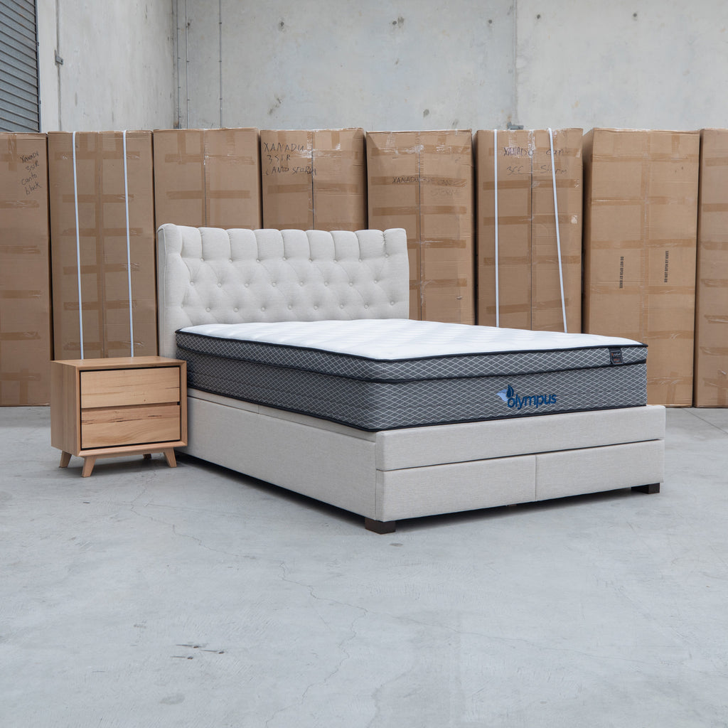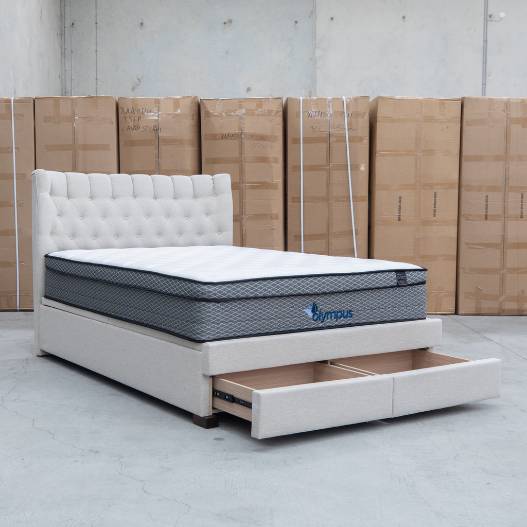 The Blake Queen Upholstered Gas Lift Storage Bed combines sophisticated design with practical functionality. Featuring a button-tufted headboard that adds visual depth and elegance, this bed maximizes your bedroom space with integrated gas lift storage and two built-in drawers within the footboard. The smooth gas lift mechanism provides effortless access to under-bed storage, while the oat white upholstery offers a versatile, contemporary aesthetic that complements any décor.