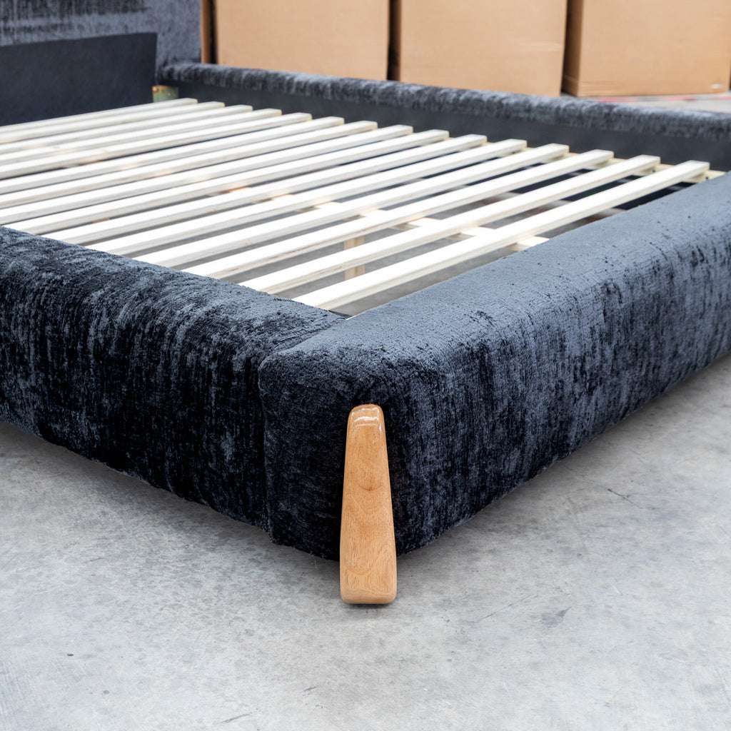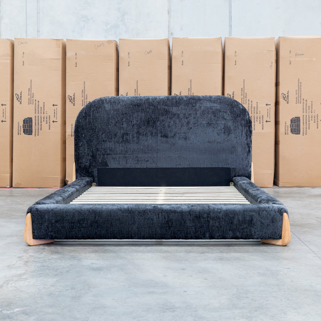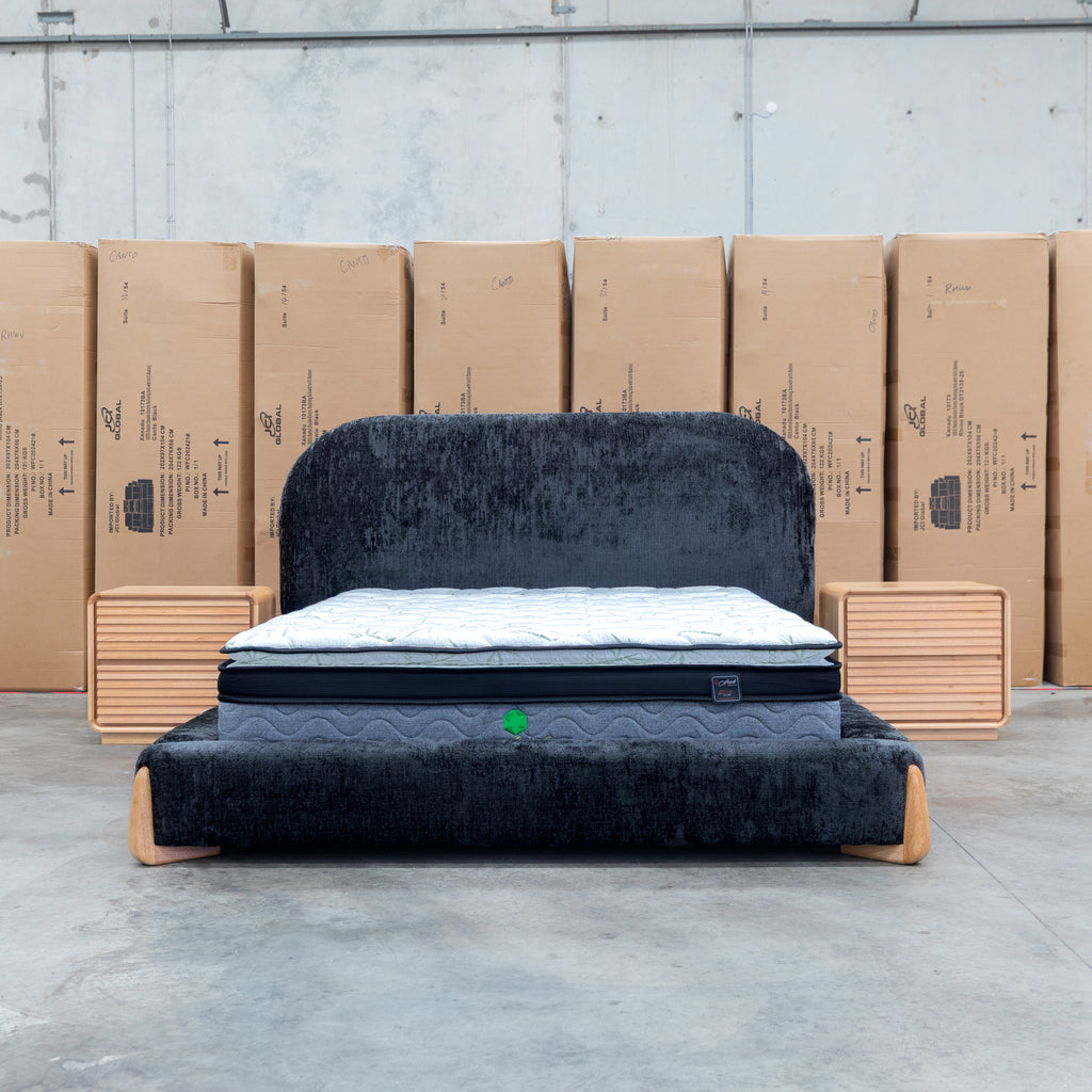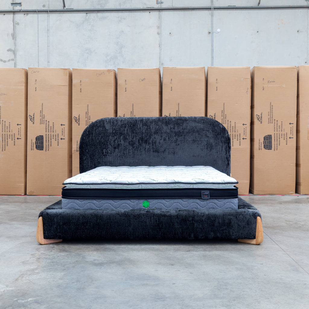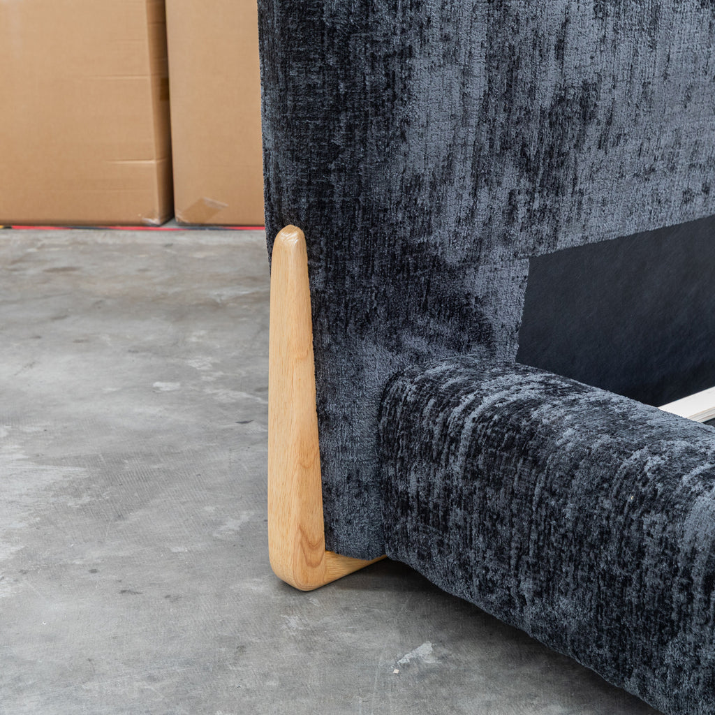 The Okina Upholstered Bed showcases refined bedroom design through its carefully considered details. Luxurious textured fabric upholstery adds sophisticated dimension to your sleeping space, while the sculptural curved headboard serves as an architectural statement piece. Premium timber legs ground the frame with substantial presence and enduring quality. Ideal for those who appreciate thoughtful construction and timeless aesthetic appeal.
