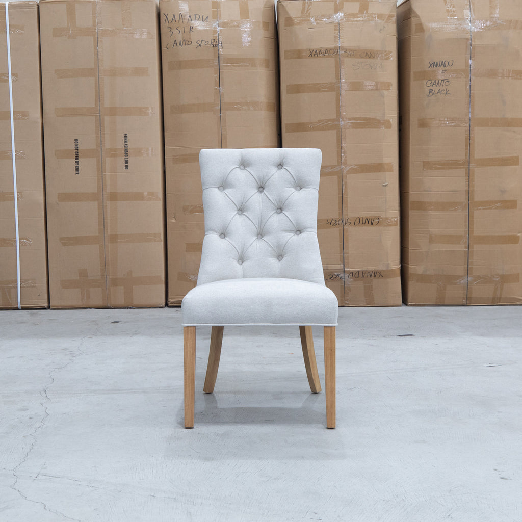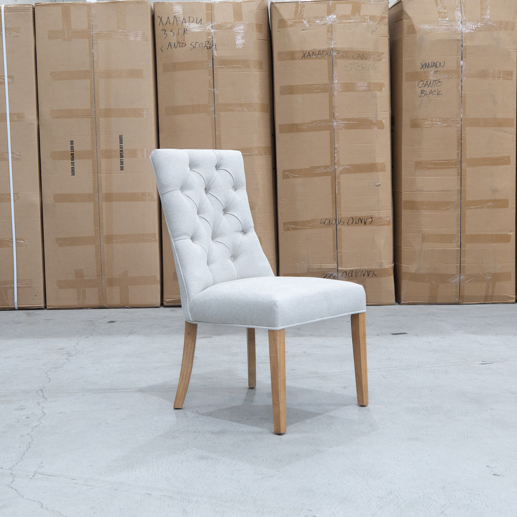 The Semillon Dining Chair adds timeless elegance to any dining room. This luxurious chair features a minimalist look with a button tufted back, and is upholstered in a soft touch fabric for an inviting feel.