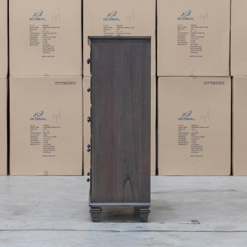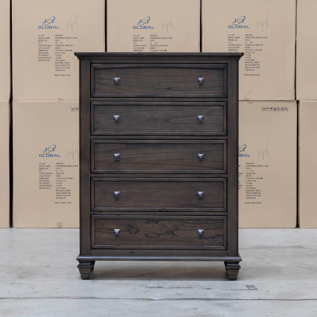 The Library Five Drawer Tallboy offers sturdy metal handles and smooth runners for durable, effortless drawer operation. Its top drawer is lined with soft velvet, providing a protective space ideal for delicate items. This blend of robust hardware and refined interior details ensures both functionality and elegance for your bedroom storage needs.