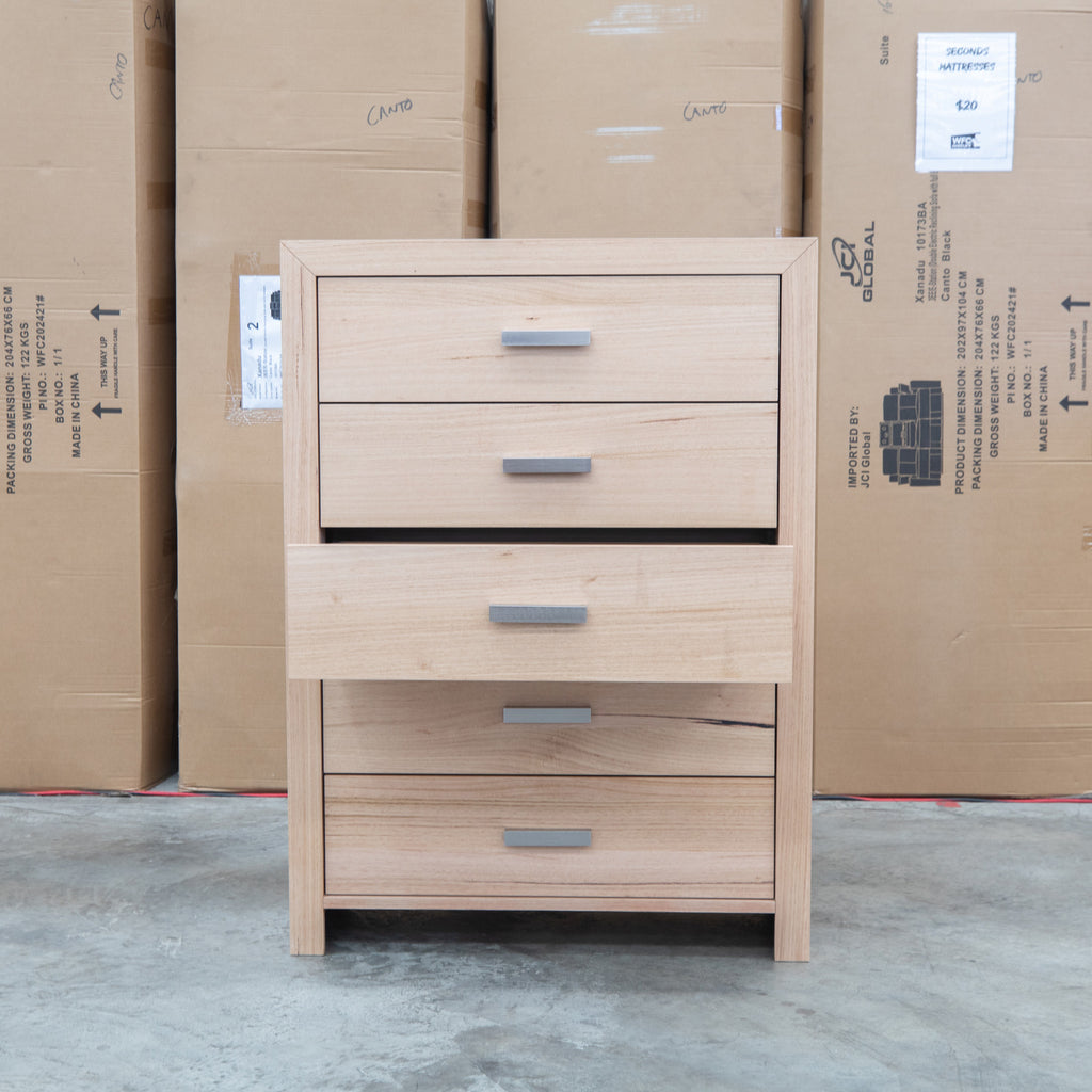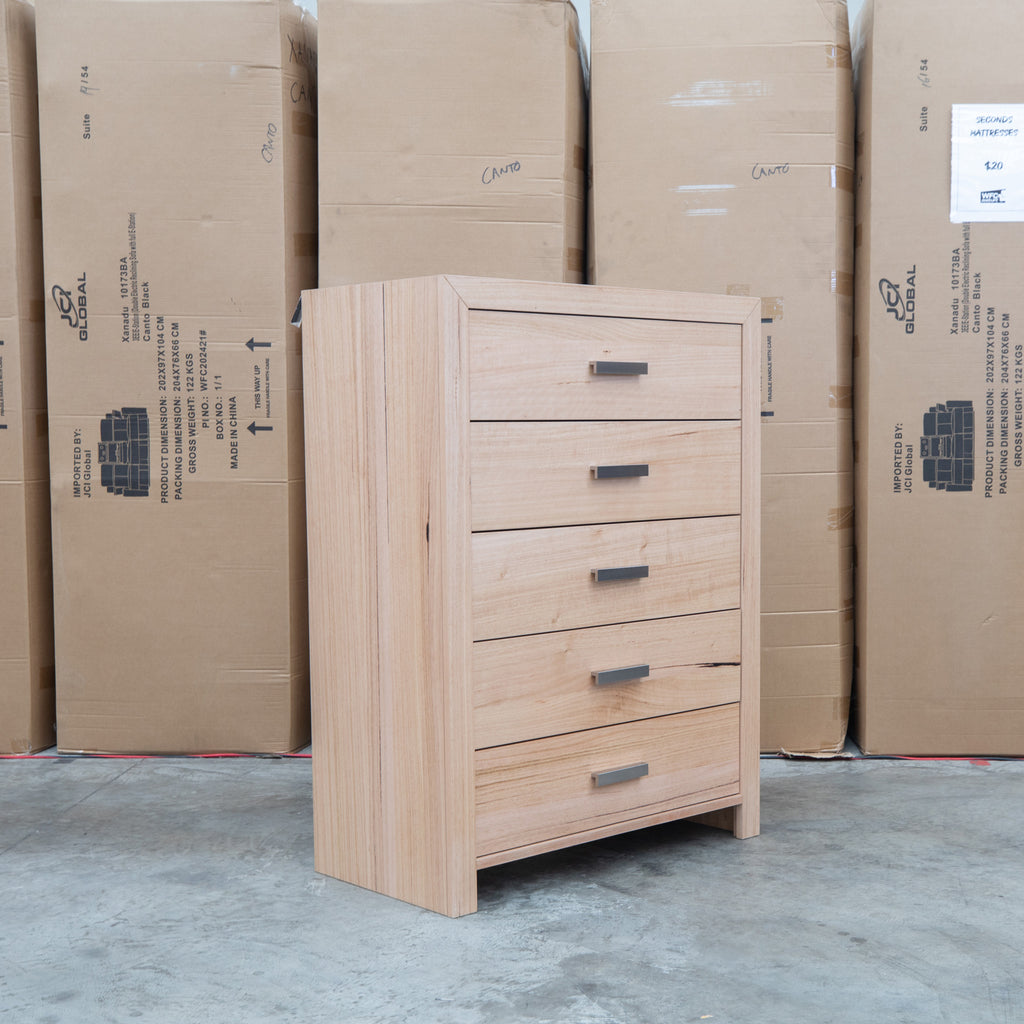 This striking tallboy combines messmate hardwood construction with practical storage solutions. Five generous drawers glide smoothly on quality metal runners, ensuring effortless access to your belongings. Soft velvet linings protect delicate items while adding a touch of refinement to your storage experience. Sturdy metal handles provide reliable grip and complement the piece's timeless aesthetic.