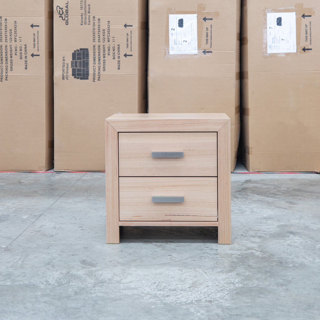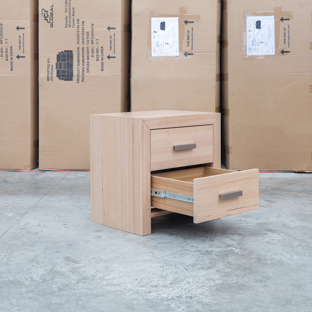 The Como Messmate Two Drawer Bedside combines timeless design with practical functionality. Crafted from natural timber with a warm, authentic finish, this piece showcases the wood's inherent character and grain patterns. Sturdy metal handles provide reliable operation and a contemporary accent, while the bedside's clean, straight-line silhouette ensures it complements both modern and traditional bedroom settings.