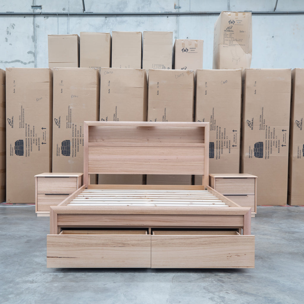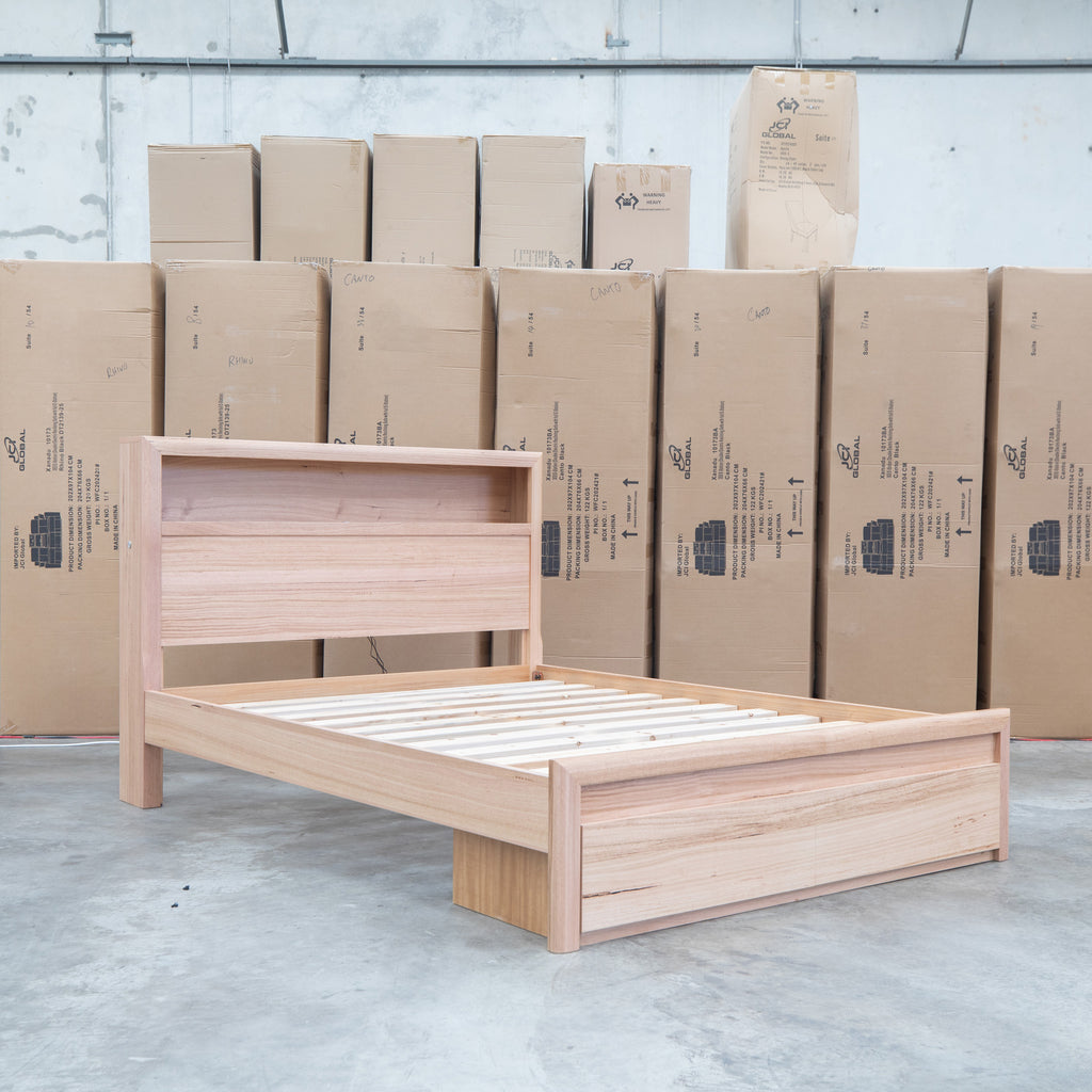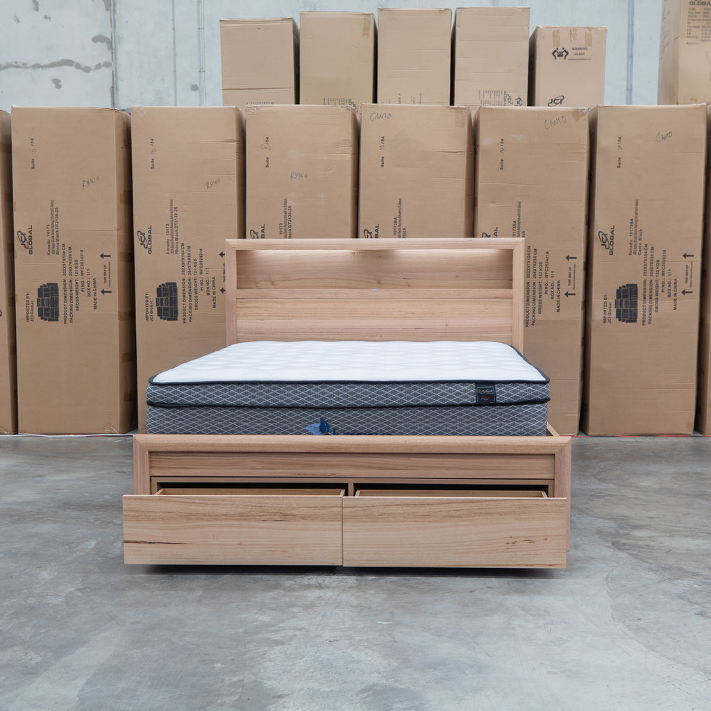 The Dalton Messmate Storage Bed combines practical design with modern convenience. Featuring integrated reading lights positioned at the headboard, this bed provides focused illumination for nighttime reading without disturbing your partner. USB and USB-C ports built into the frame keep your devices charged and within arm's reach. Crafted from quality messmate timber, this bed delivers both functionality and durability for the contemporary bedroom.