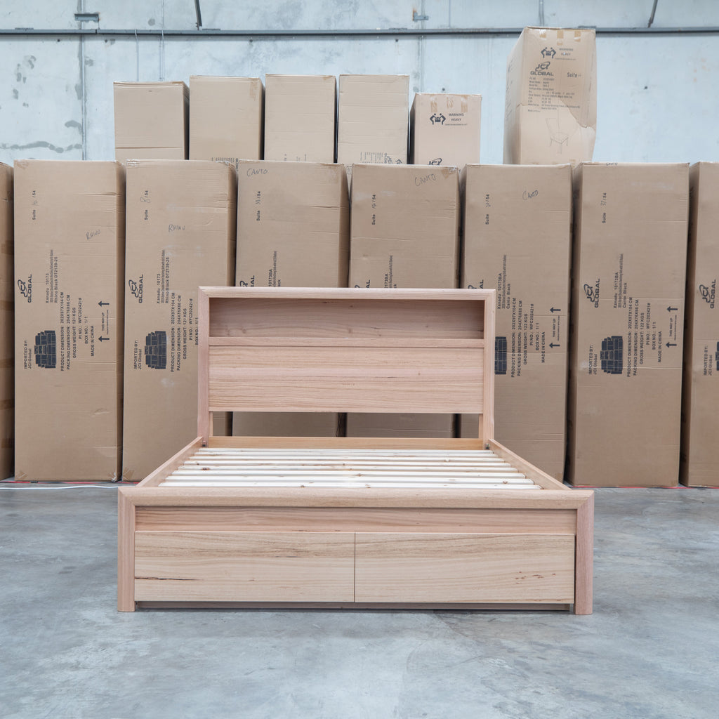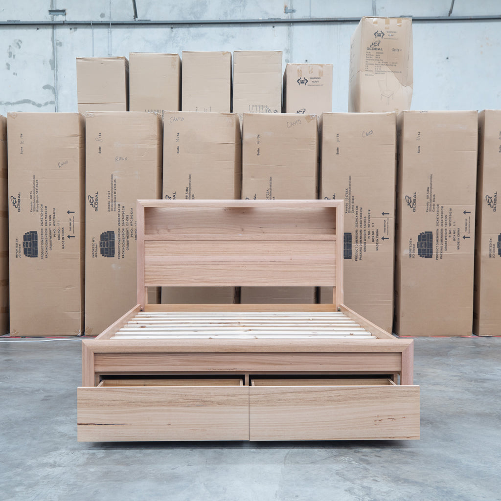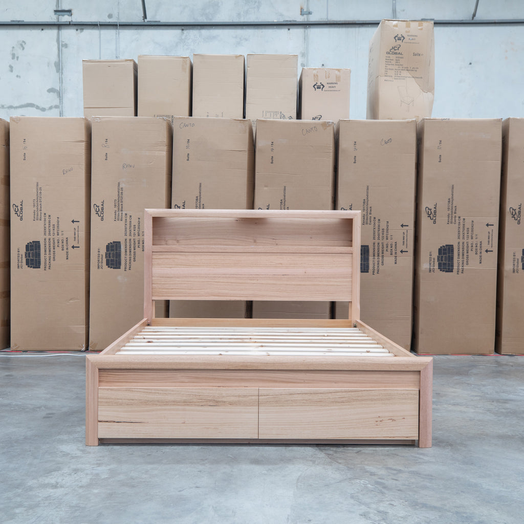 The Dalton Messmate Storage Bed combines practical design with modern convenience. Featuring integrated reading lights positioned at the headboard, this bed provides focused illumination for nighttime reading without disturbing your partner. USB and USB-C ports built into the frame keep your devices charged and within arm's reach. Crafted from quality messmate timber, this bed delivers both functionality and durability for the contemporary bedroom.