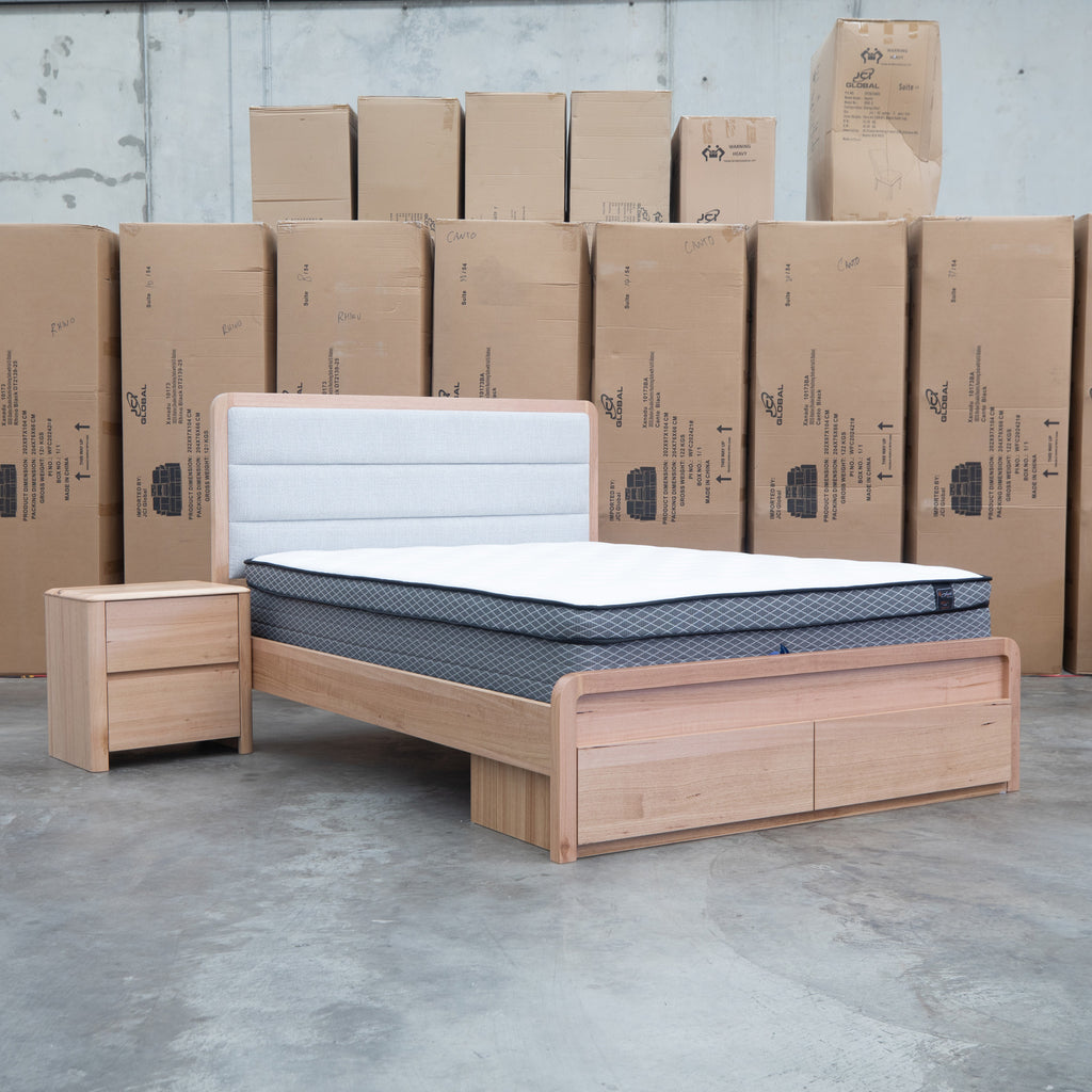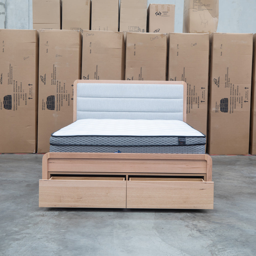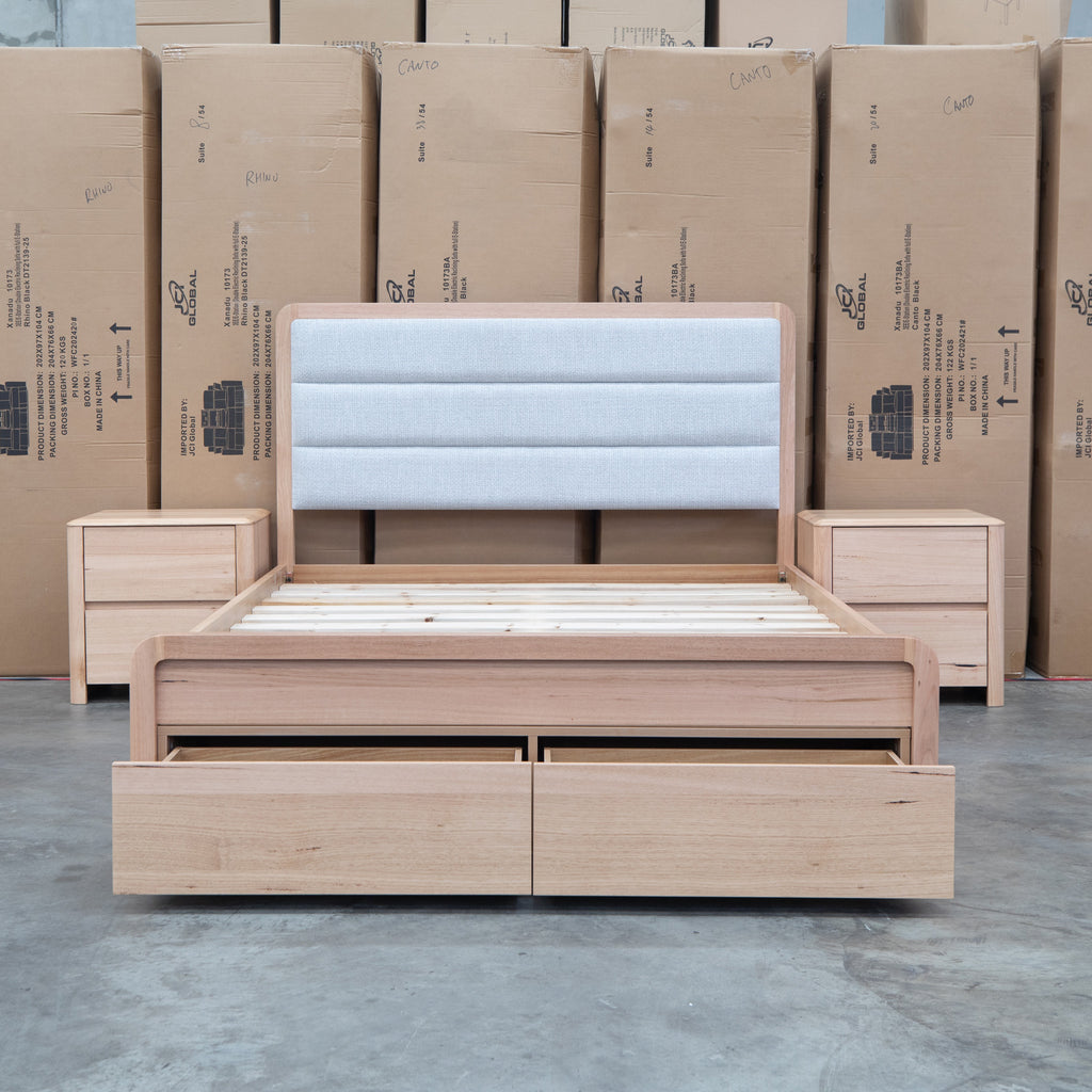 The Island Messmate Storage Bed combines functional design with natural appeal. The channel stitched fabric headboard insert adds visual interest and comfort, while built-in storage drawers maximize space efficiency—ideal for bedrooms where storage is at a premium. Crafted from natural timber with a warm finish, this bed brings organic character to any bedroom setting. A practical choice for those seeking both style and substance in their sleeping arrangements.