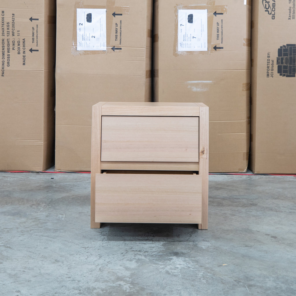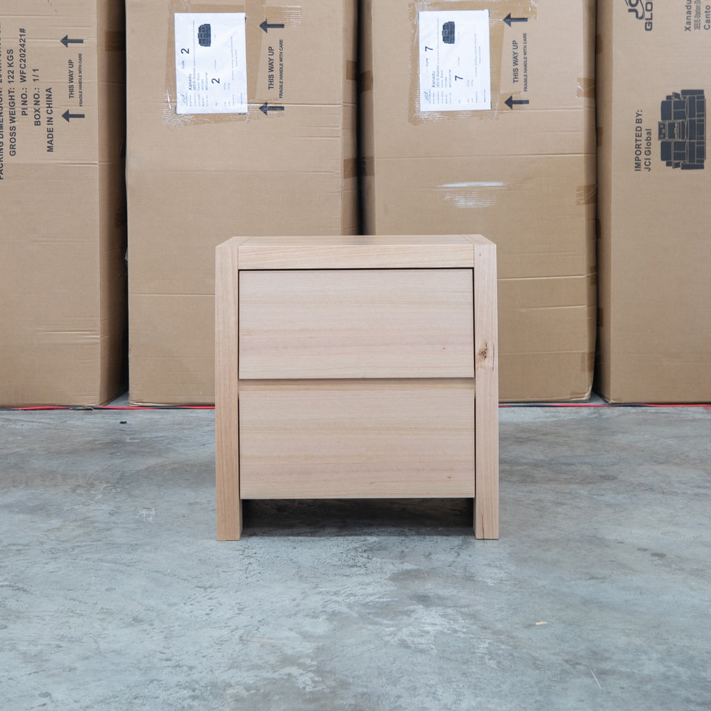 This elegant bedside table showcases a distinctive curved silhouette that adds architectural interest to any bedroom. Crafted from messmate timber with a warm natural finish, it celebrates the wood's authentic grain and character. The handless design creates clean, uncluttered lines while the two spacious drawers provide practical storage for bedside essentials. A sophisticated choice for those seeking functional furniture with refined aesthetics.