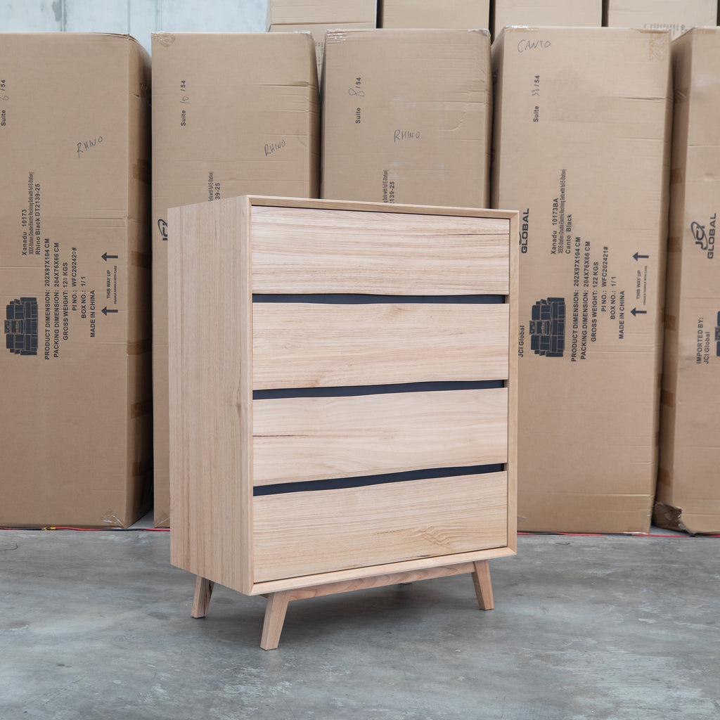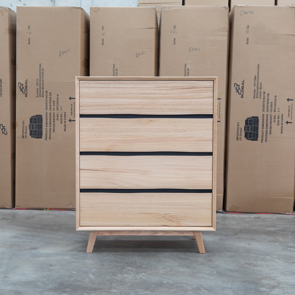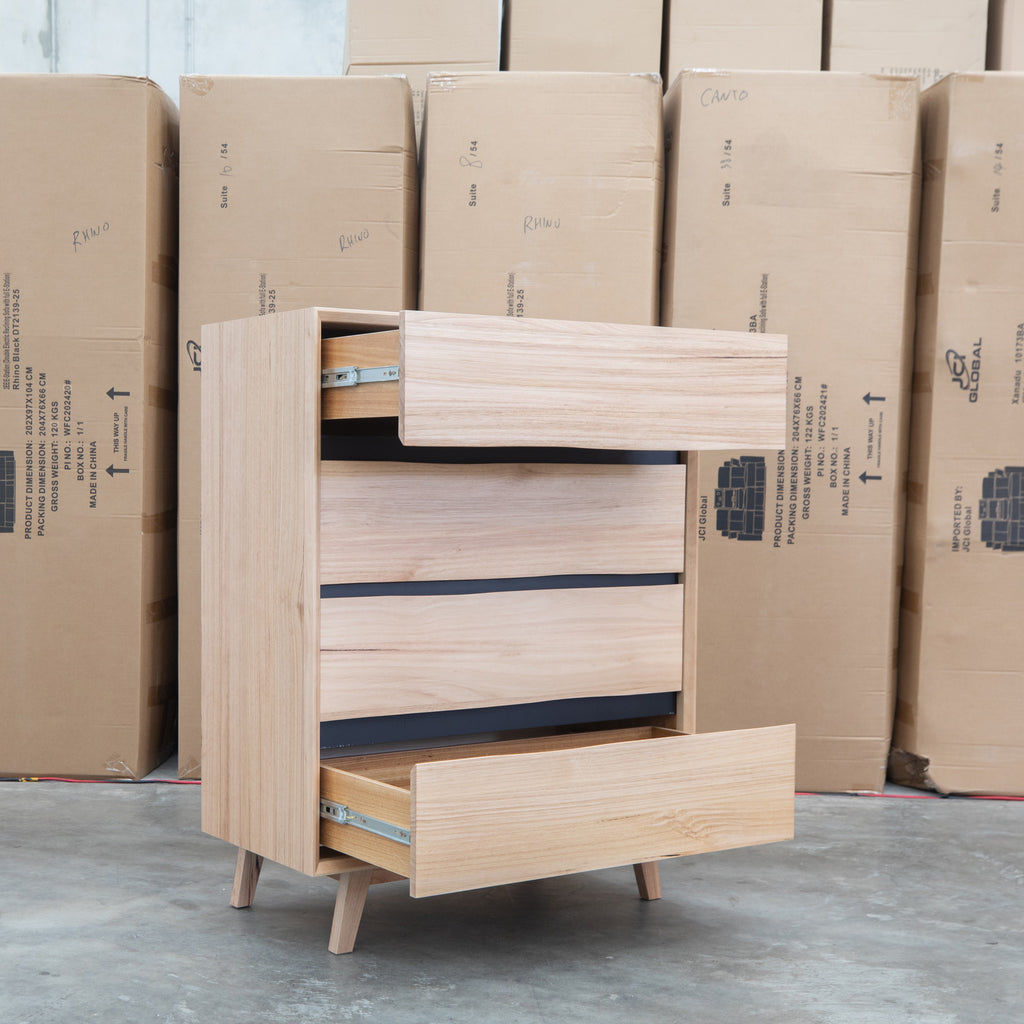 Crafted from natural messmate timber, this five drawer tallboy combines warm wood tones with sophisticated black accents for a contemporary aesthetic. The handleless design creates clean, uninterrupted lines while maintaining effortless functionality through recessed pulls. Ideal for modern bedrooms seeking understated elegance, this piece offers practical storage without visual clutter. Built to last with quality timber construction, it's a versatile addition to various interior styles.