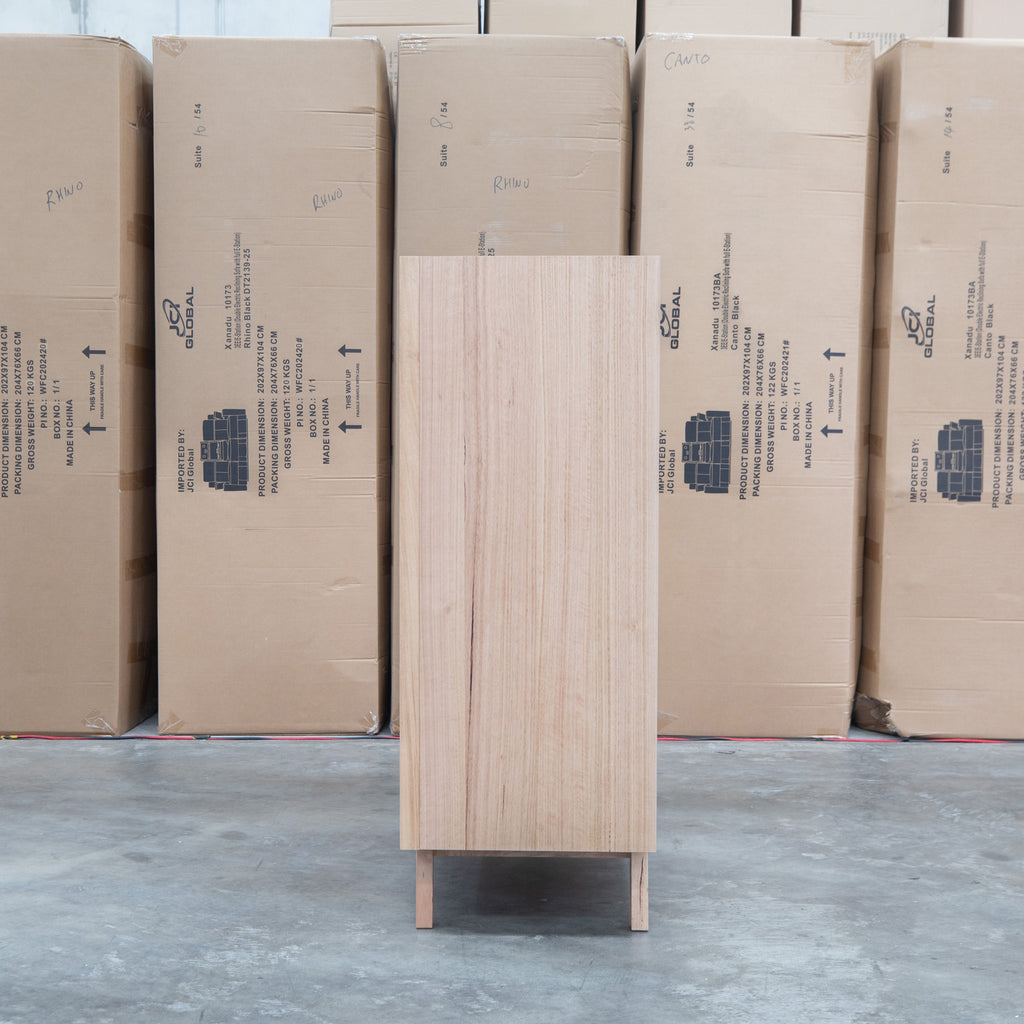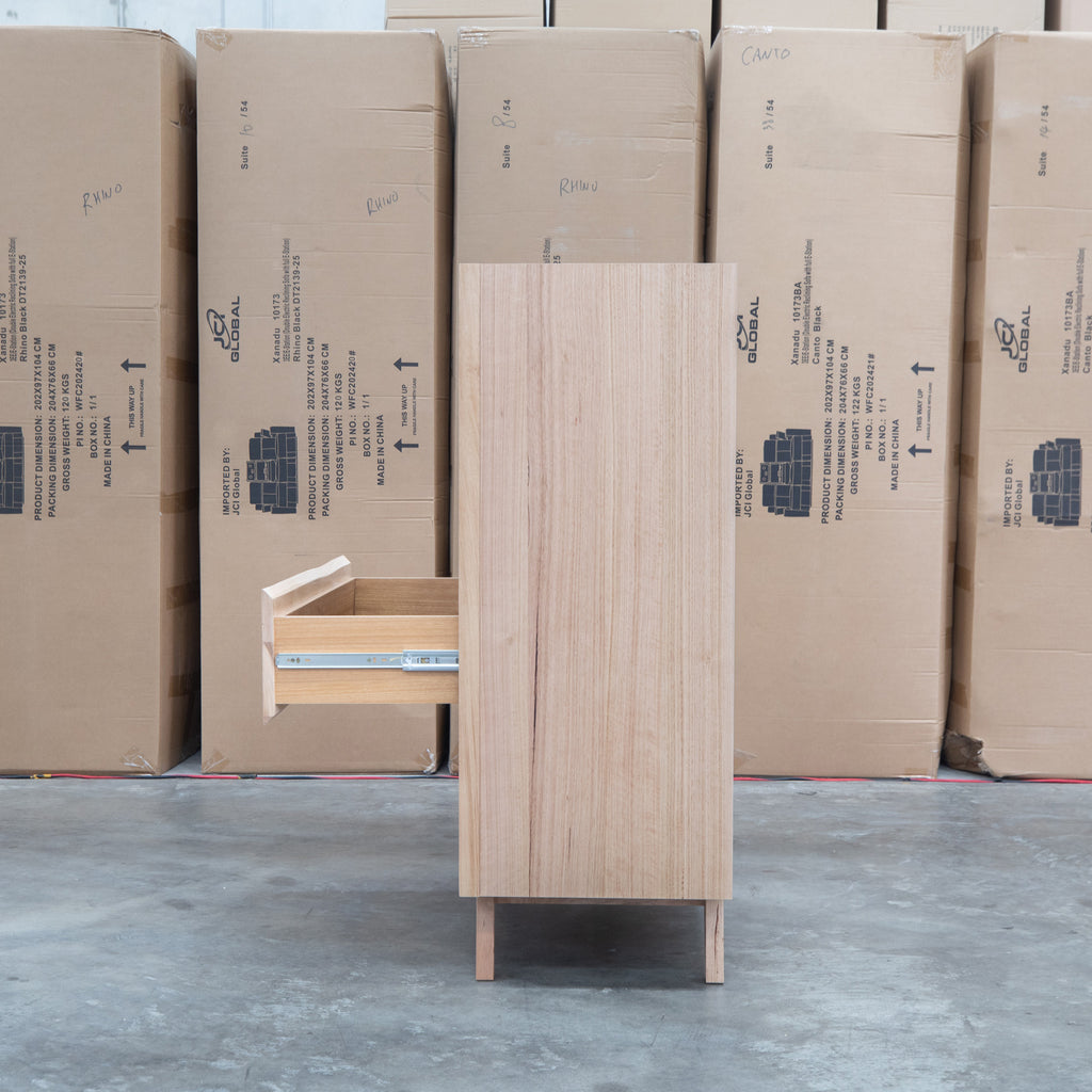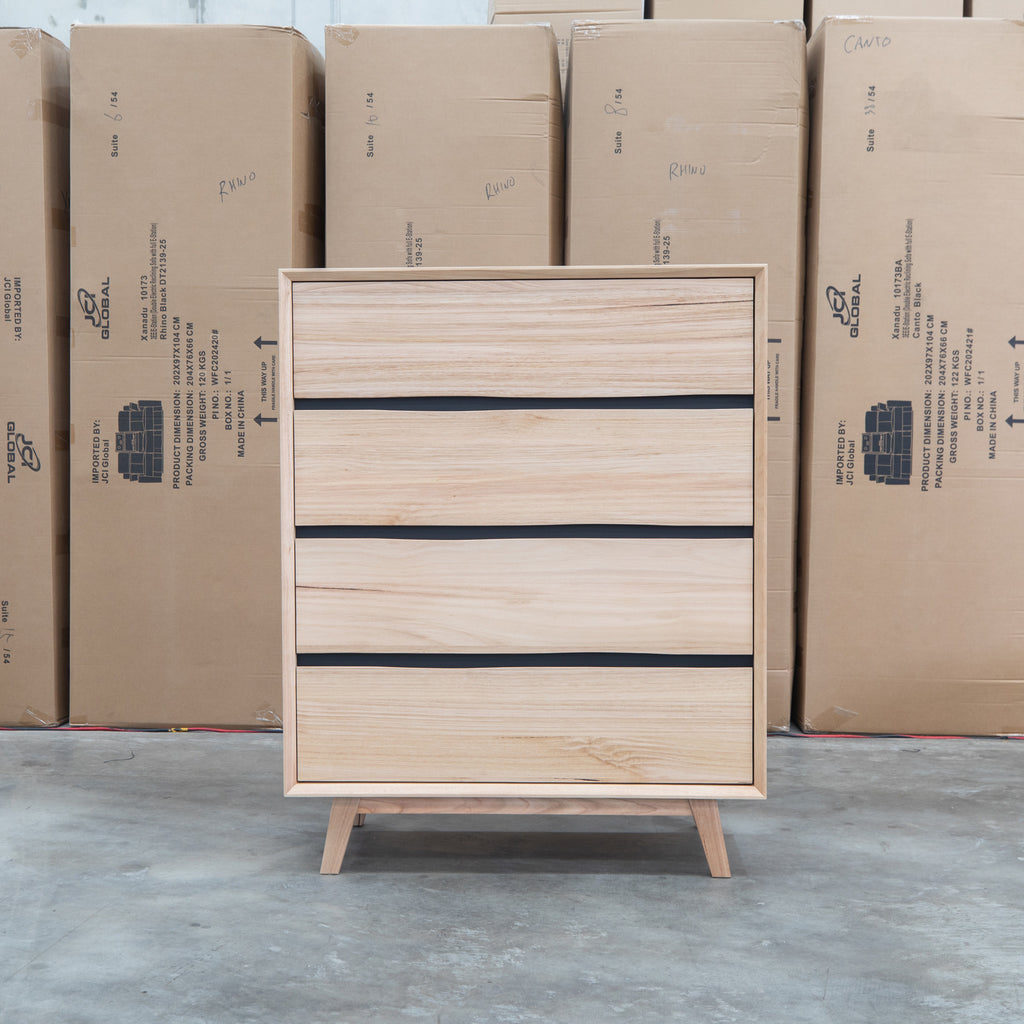 Crafted from natural messmate timber, this five drawer tallboy combines warm wood tones with sophisticated black accents for a contemporary aesthetic. The handleless design creates clean, uninterrupted lines while maintaining effortless functionality through recessed pulls. Ideal for modern bedrooms seeking understated elegance, this piece offers practical storage without visual clutter. Built to last with quality timber construction, it's a versatile addition to various interior styles.