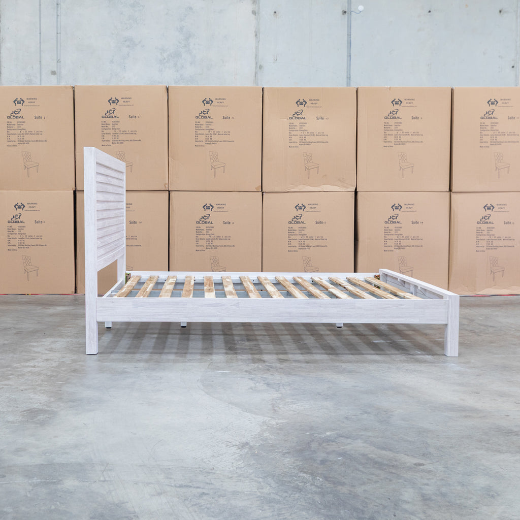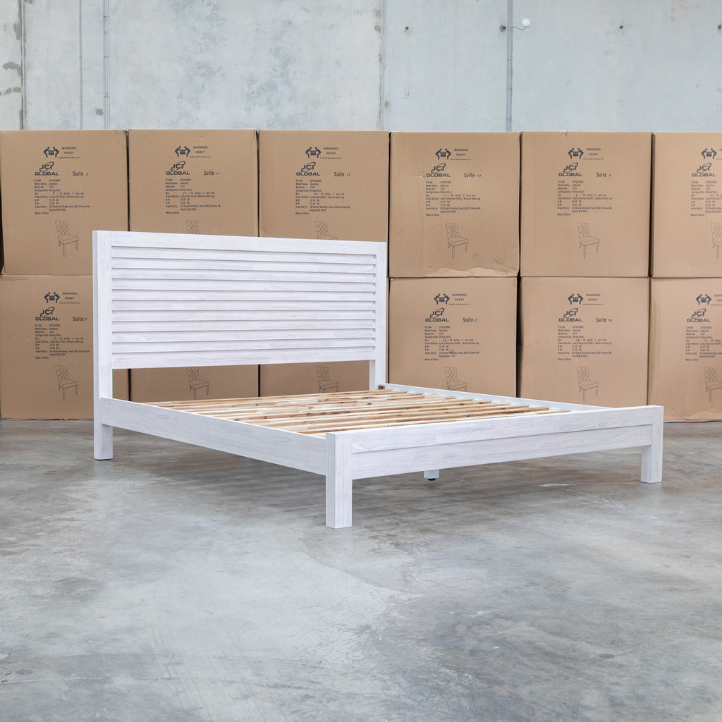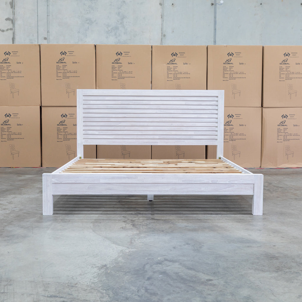 Crafted from premium mountain ash timber, the Valentino queen bed features a striking slatted headboard that combines natural beauty with contemporary design. The brushed white timber tones and clean lines create an elegant focal point for any bedroom. Durable construction ensures lasting quality, while the timeless aesthetic complements both modern and traditional interiors. A sophisticated choice for those seeking solid wood furniture with understated style.