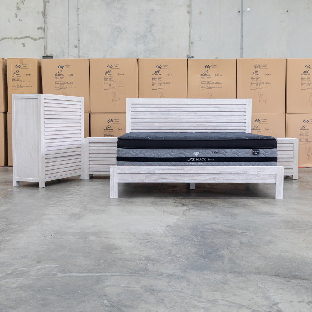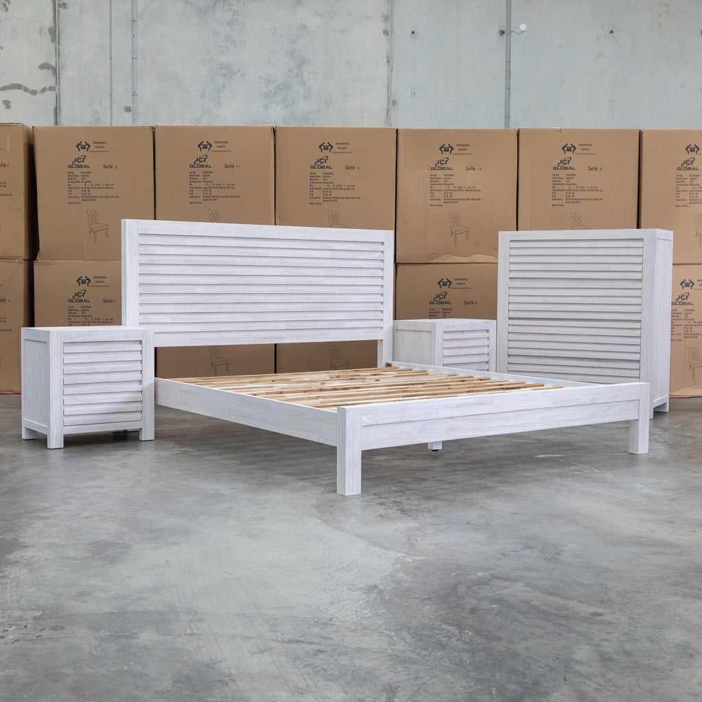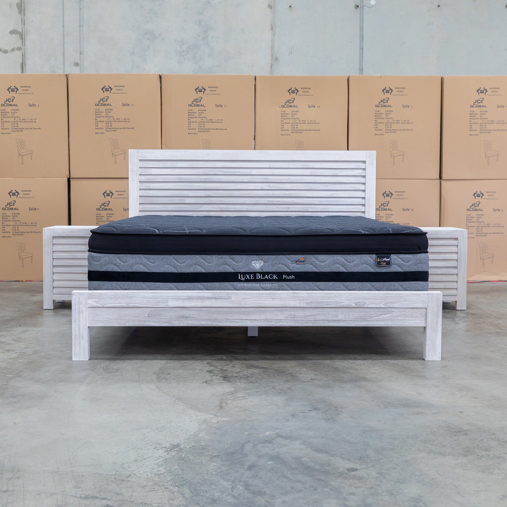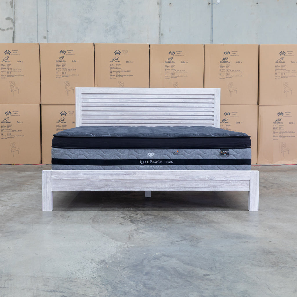 Crafted from premium mountain ash timber, the Valentino queen bed features a striking slatted headboard that combines natural beauty with contemporary design. The brushed white timber tones and clean lines create an elegant focal point for any bedroom. Durable construction ensures lasting quality, while the timeless aesthetic complements both modern and traditional interiors. A sophisticated choice for those seeking solid wood furniture with understated style.