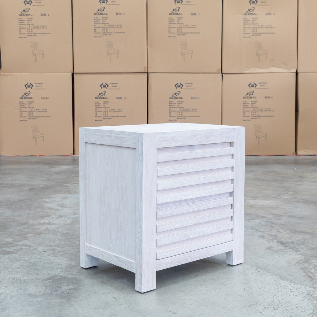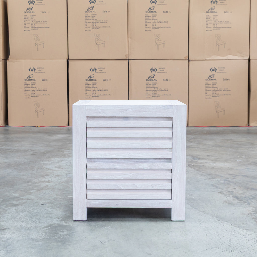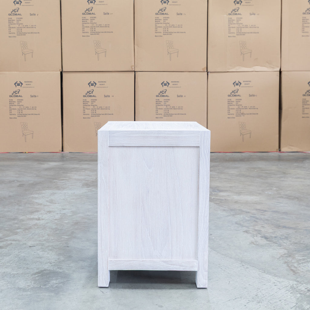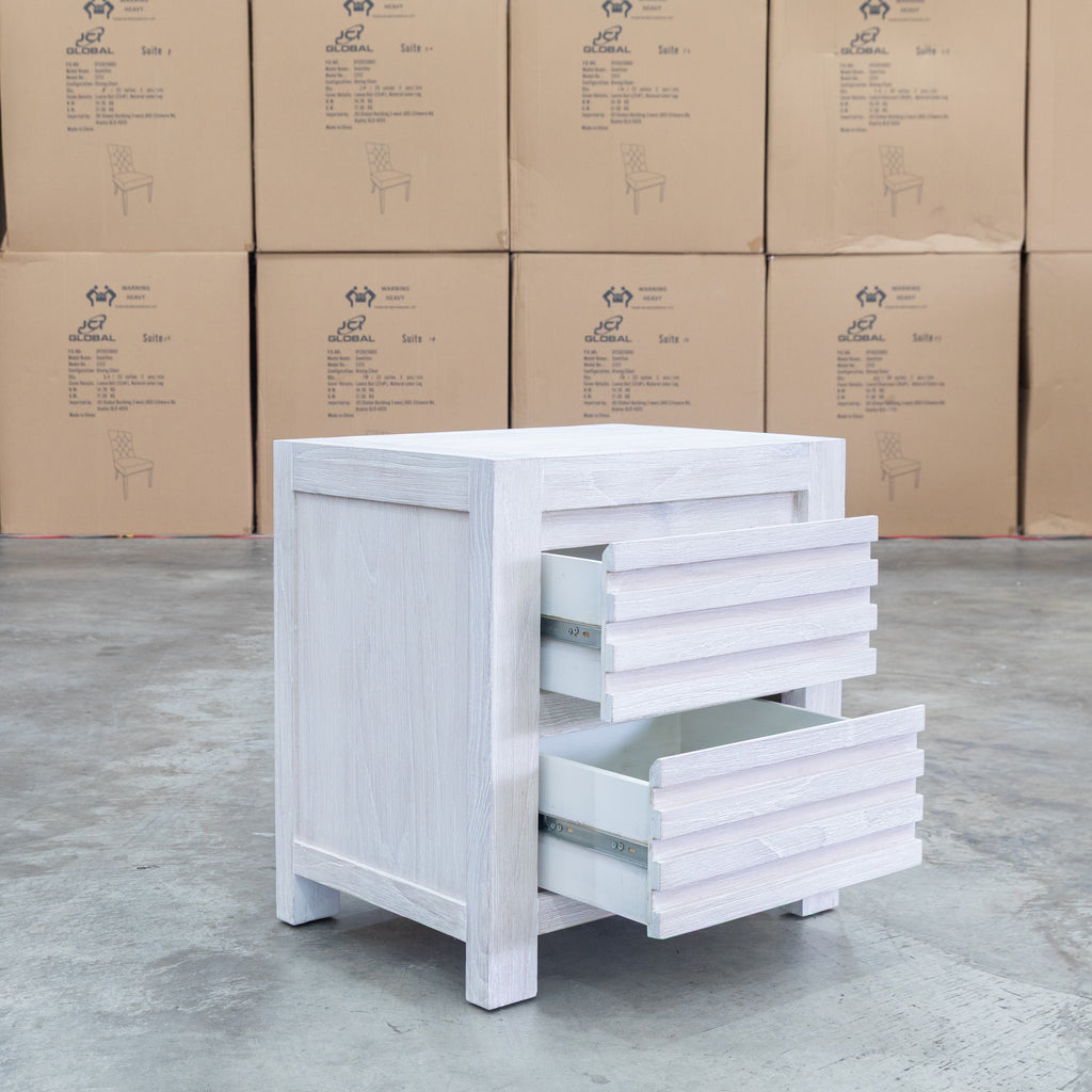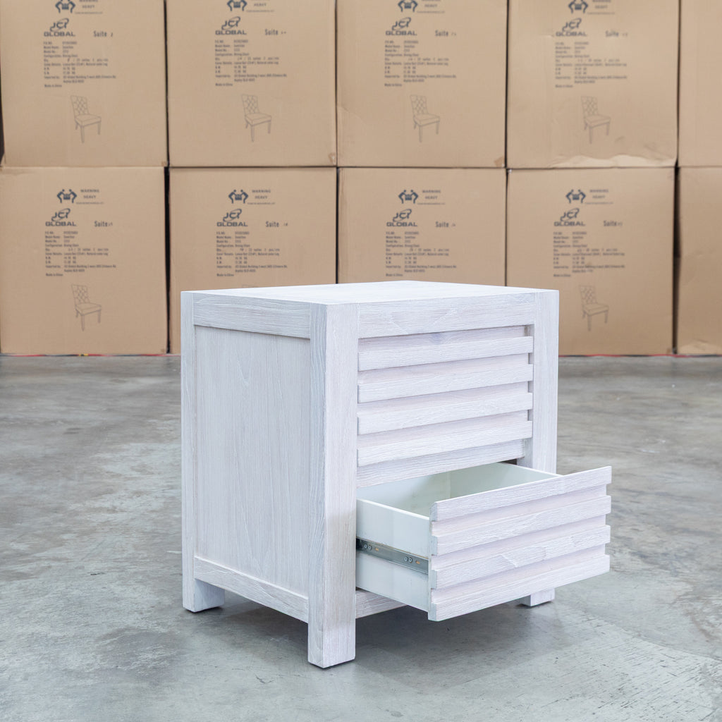 The Valentino Two Drawer Mountain Ash Bedside combines timeless elegance with practical storage. Two spacious drawers crafted from mountain ash timber feature distinctive slatted detailing, while the brushed white finish creates a contemporary aesthetic that suits modern and coastal interiors. Built for durability, this bedside table provides reliable storage for your bedroom essentials while adding functional style to your sleeping space.